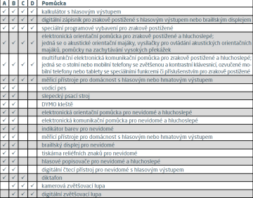Seznam zvláštních pomůcek najdeme ve vyhlášce o provedení některých ustanovení zákona o poskytování dávek osobám se zdravotním postižením (vyhláška MPSV ze dne 29.11.2011, (č.388/2011 Sb.). Doplněná vyhláškou č. 408/2017)
